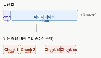 cmd + image data를 붙여서 보냈는데 모든 수신에서 cmd를 체크하니 정상적인 로직을 태우지 못했던 것이다. 수정을 하여 정상으로 수신하도록 하였다.