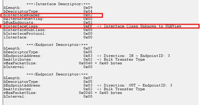 InterfaceNuber가 0x02이고 InterfaceClass가 0xFF로 vendor specific인 것을 확인할 수 있다. 동일하게 가상 COM 장치도 확인해보겠다.