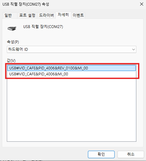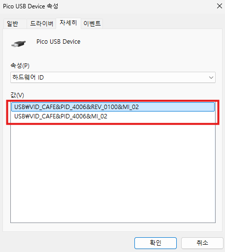 속성에서 하드웨어 ID를 확인해 보면 기존과 다르게 MI_02가 붙은 것을 확인할 수 있다. Multiple Interface의 약자로 해당 장치가 복합 장치일 때, 몇 번째 인터페이스인지를 나타내는 식별자라고 한다.