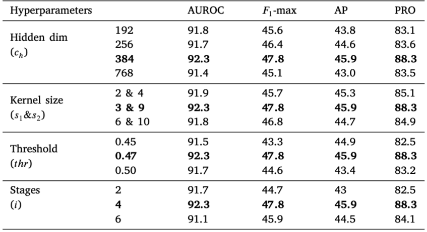 - 숨겨진 차원(hidden dimension), 커널 크기(kernel size), 임계값(threshold) 및 단계 수(stages)와 같은 하이퍼파라미터들이 성능에 중요한 영향을 미친다는 것이 확인
