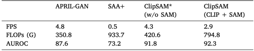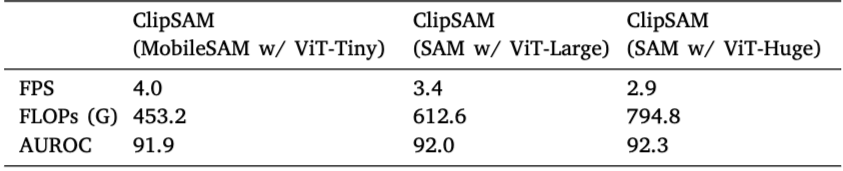 - 이러한 지표들을 통해 ClipSAM이 기존의 최첨단 ZSAS 방법들과 비교했을 때 우수한 성과를 나타내는 것을 확인할 수 있음