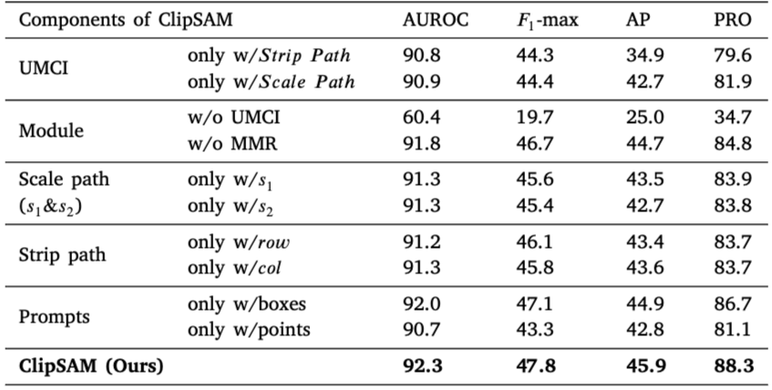 - 이를 통해 ClipSAM은 다양한 이상 탐지 상황에서도 견고한 성능을 발휘할 수 있음