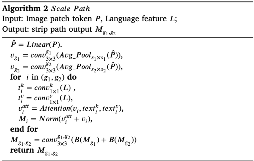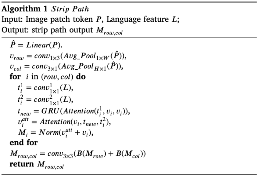 Strip Path는 입력으로 텍스트 특징 벡터 ( L )과 비주얼 패치 토큰 ( P )를 사용하며, 수평 및 수직 방향에서 로우(row)와 컬럼(column) 수준의 특징을 추출하여 정확한 위치를 식별함