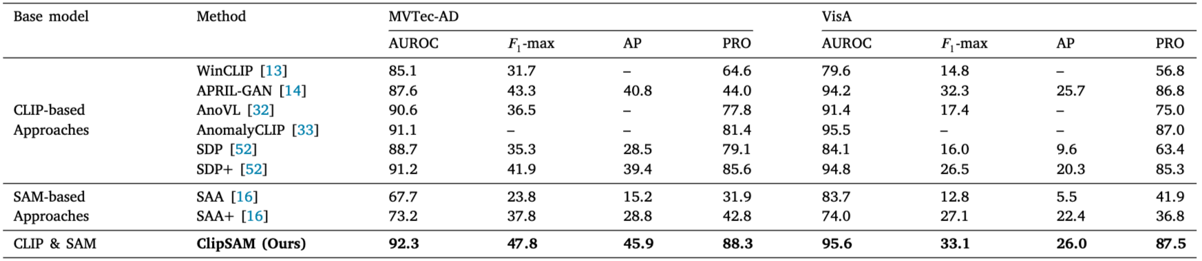 - MVTec-AD 및 VisA 데이터셋에서 제안한 ClipSAM 프레임워크의 성능을 평가