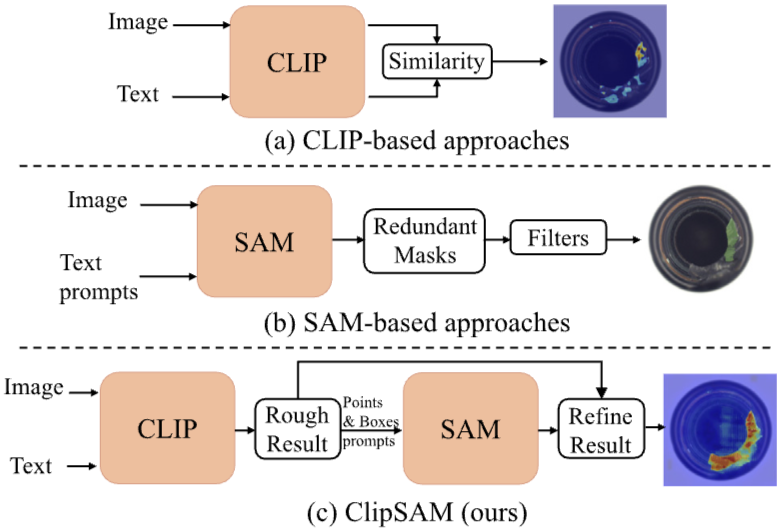 - CLIP 기반 접근, SAM 기반 접근 및 본 논문에서 제안하는 ClipSAM 접근의 구조적 비교를 시각적으로 나타냄