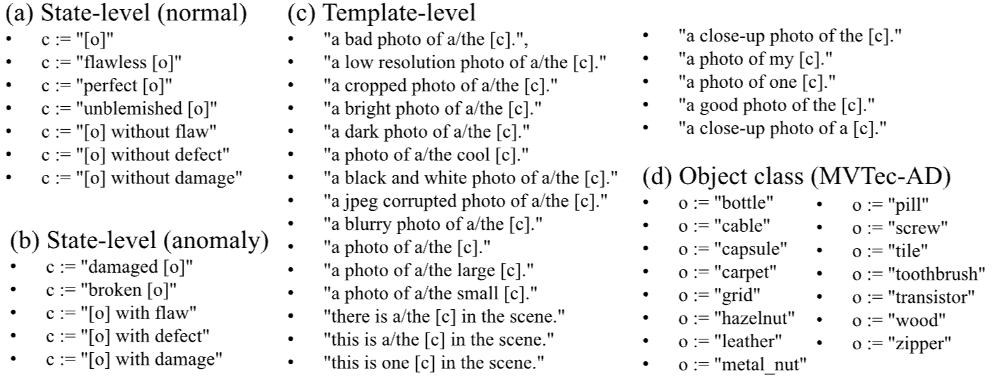 - 이 프롬프트는 WinCLIP과 같은 이전 연구에서 사용된 것과 유사하게 구성되며, 템플릿, 상태 단어 및 클래스 이름을 조합하여 개체의 특성을 설명하는 문장을 형성함