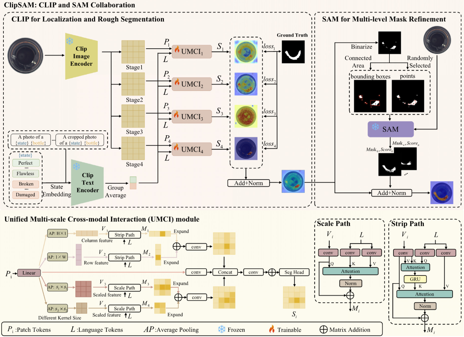 - 이를 위해 Unified Multi-scale Cross-modal Interaction(UMCI) 모듈을 도입하여 언어와 비주얼 피처 간의 상호작용을 통해 - 이상 부분의 의미를 학습하고, Multi-level Mask Refinement(MMR) 모듈을 통해 CLIP의 위치 정보를 기반으로 SAM을 유도하여 마스크의 정밀도를 높이는 방식을 취하고 있음