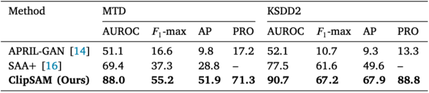 - ClipSAM은 APRIL-GAN 및 SAA+와 비교하여 MTD 및 KSDD2 데이터셋에서 모든 성능 지표에서 유의미한 향상을 보임