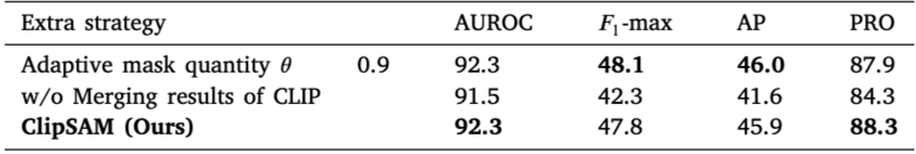 - ClipSAM의 추가 전략이 성능에 미치는 영향을 평가