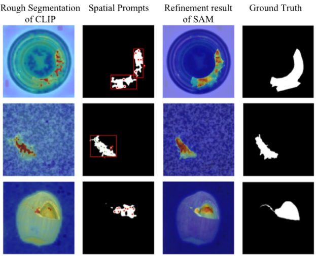 - CLIP은 전반적인 특징 정렬에 강점을 갖고 있지만, 세밀한 이상 세분화에는 부족함이 있으며, SAM은 다양한 프롬프트를 통해 세분화 가능하지만, 자주 불필요한 마스크를 생성하여 후처리가 복잡해짐