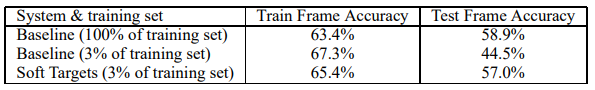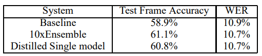 앙상블은 WER (23,000단어 테스트 세트에서)의 최종 목표에는 더 작은 개선을 가져왔지만, 다시 한 번 앙상블에서 얻은 WER의 개선이 distillation으로 전이됨