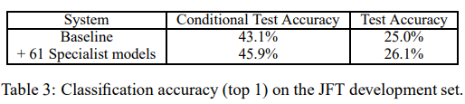 3) 실제로 큰 신경망의 경우 전체 앙상블을 훈련하는 것 조차 현실적으로 어려울 수 있지만, 매우 오랜 시간 동안 훈련된 단일 큰 네트워크의 성능을 여러 전문 네트워크를 학습하여 크게 향상시킬 수 있다는 것을 보임