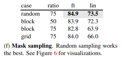 랜덤 샘플링이 MAE에 가장 적합하며 높은 마스킹 비율을 허용하면서도 좋은 정확도를 제공함