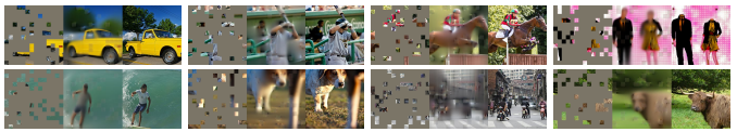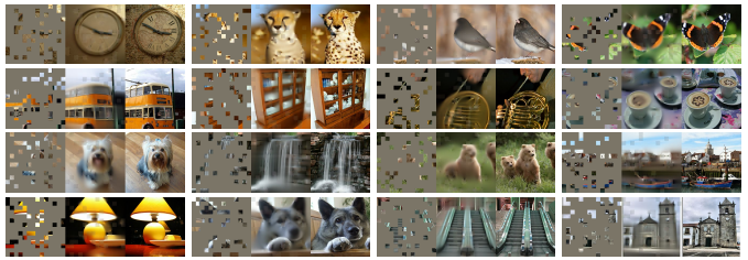 Masked image encoding은 마스킹에 의해 손상된 이미지로 부터 표현을 학습함. 선구적인 연구[59]는 마스킹을 DAE의 노이즈 유형으로 제시함. 최근 연구들은 Context Encoder [46]와 같이 convolutional networks을 사용하여 누락된 큰 영역을 예측함. NLP분야의 성공에서 영감을 받은 최근 관련 방법[6, 16, 2]은 트랜스포머[57]를 기반으로 함. iGPT[6]는 픽셀 시퀀스에서 작동하며 알려지지 않은 픽셀을 예측하며, ViT[16]는 자기 지도 학습을 위한 마스킹 패치 예측을 연구함. 가장 최근에는 BEiT[2]가 이산 토큰을 예측할 것을 제안함[44, 50].