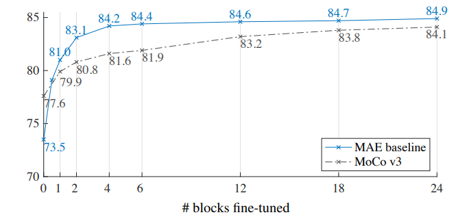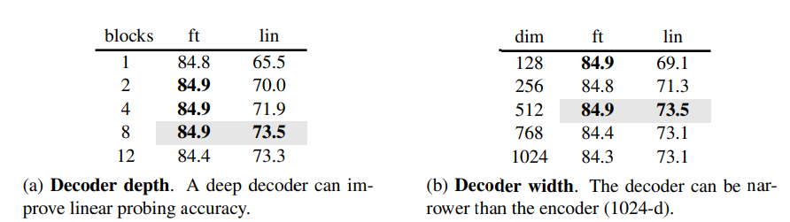 Decoder depth(Transformer 블록 수) -> 선형 탐색에는 깊은 디코더가 중요하나, 파인튜닝에는 영향이 적음.