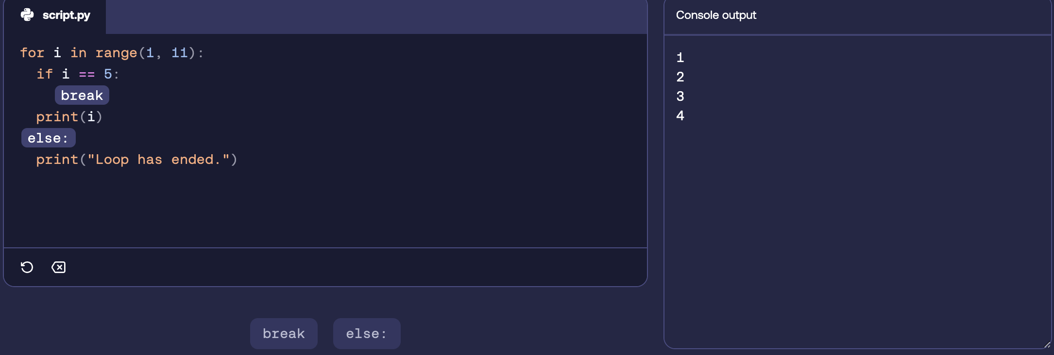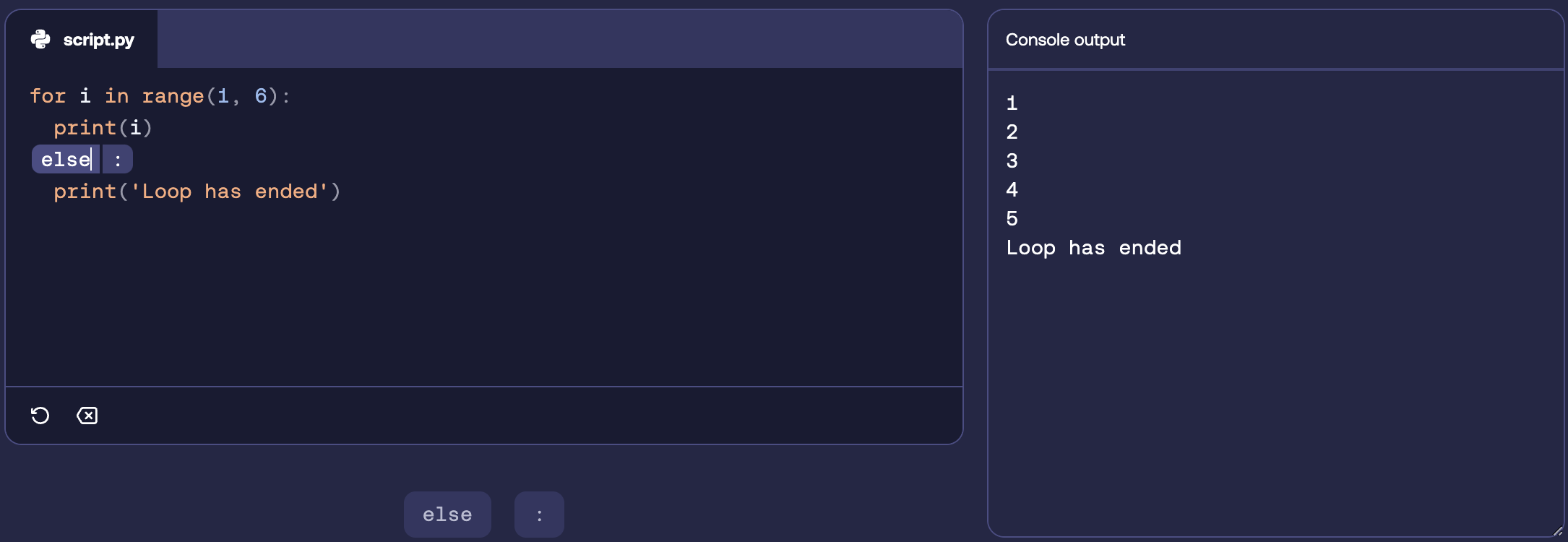 Finally, the else statement in loops is executed when the loop has finished. Remember, else in a loop differs from else in an if statement.