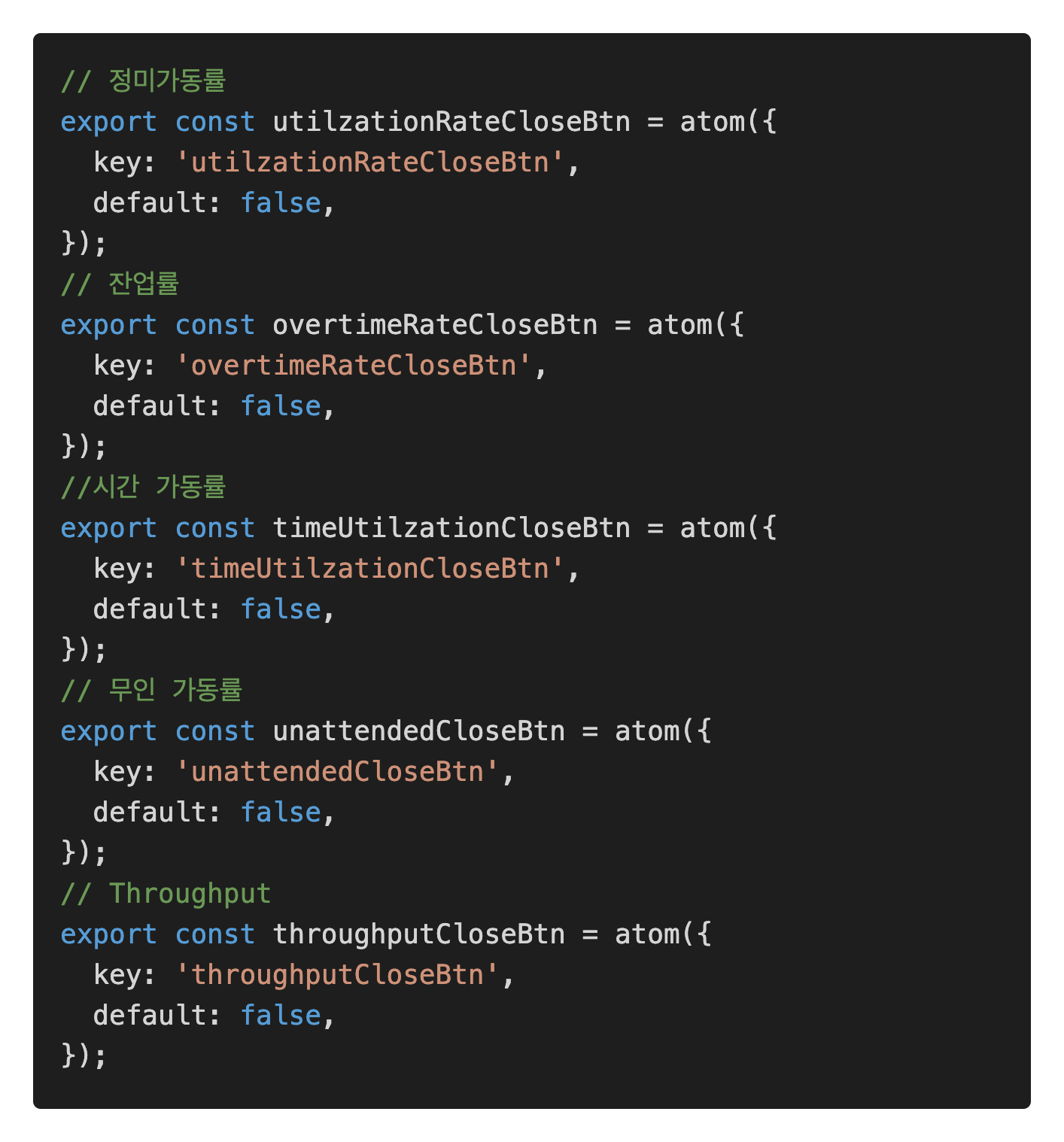 //OverallEfficiency component // Recoil const [isOpenDetail, setIsOpenDetail] = useRecoilState(efficiencyCloseBtn); const utilzationRate = useSetRecoilState(utilzationRateCloseBtn); const overtimeRatec = useSetRecoilState(overtimeRateCloseBtn); const timeUtilzation = useSetRecoilState(timeUtilzationCloseBtn); const unattended = useSetRecoilState(unattendedCloseBtn); const throughput = useSetRecoilState(throughputCloseBtn);// detail open const handleOpenDetails = () => { setIsOpenDetail(!isOpenDetail); utilzationRate(false); overtimeRatec(false); timeUtilzation(false); unattended(false); throughput(false); };