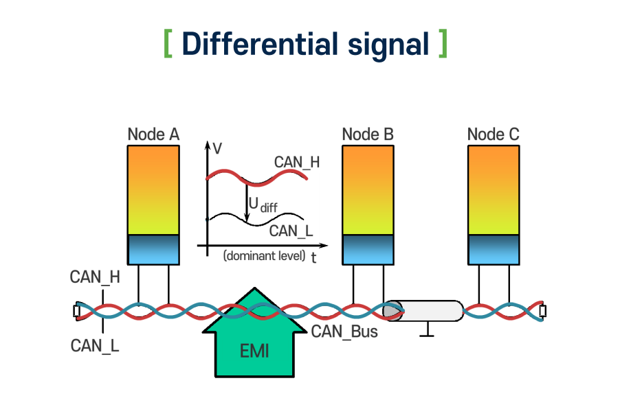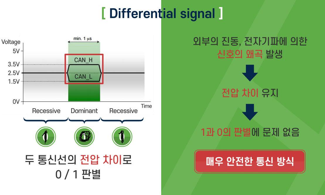 - 두 통신선의 전압 차이로 0 또는 1 판별