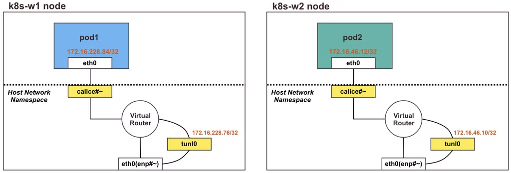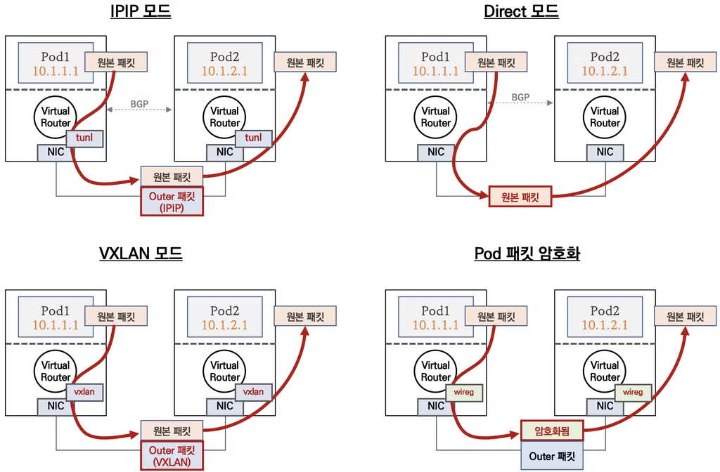 노드와 노드 구간 파드 간 통신이 IPIP encapsulation을 통해 이루어진다.