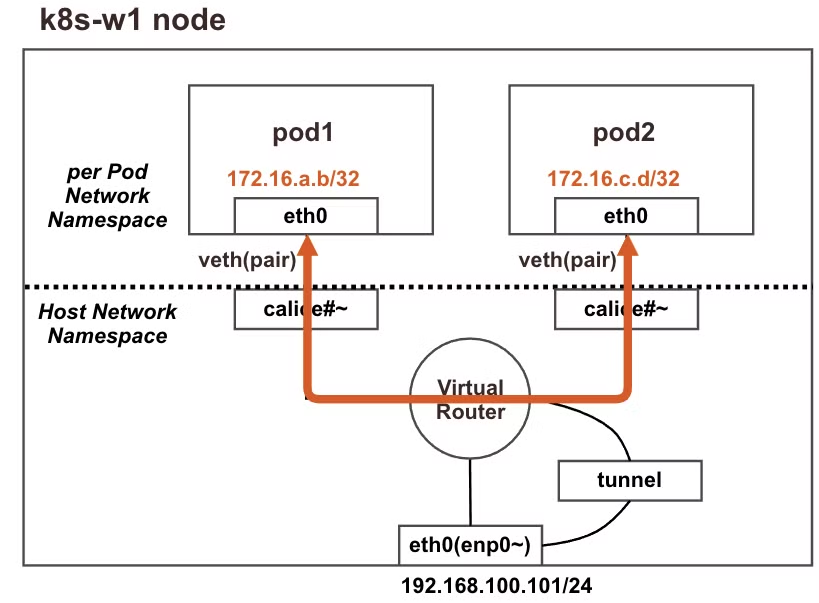 직접 파드에 쉘 접속 후 확인해봤을 때, 네트워크 인터페이스인 calice#~ 와 veth 연결이 돼 있으며 IP는 32bit 서브넷을 가진다.