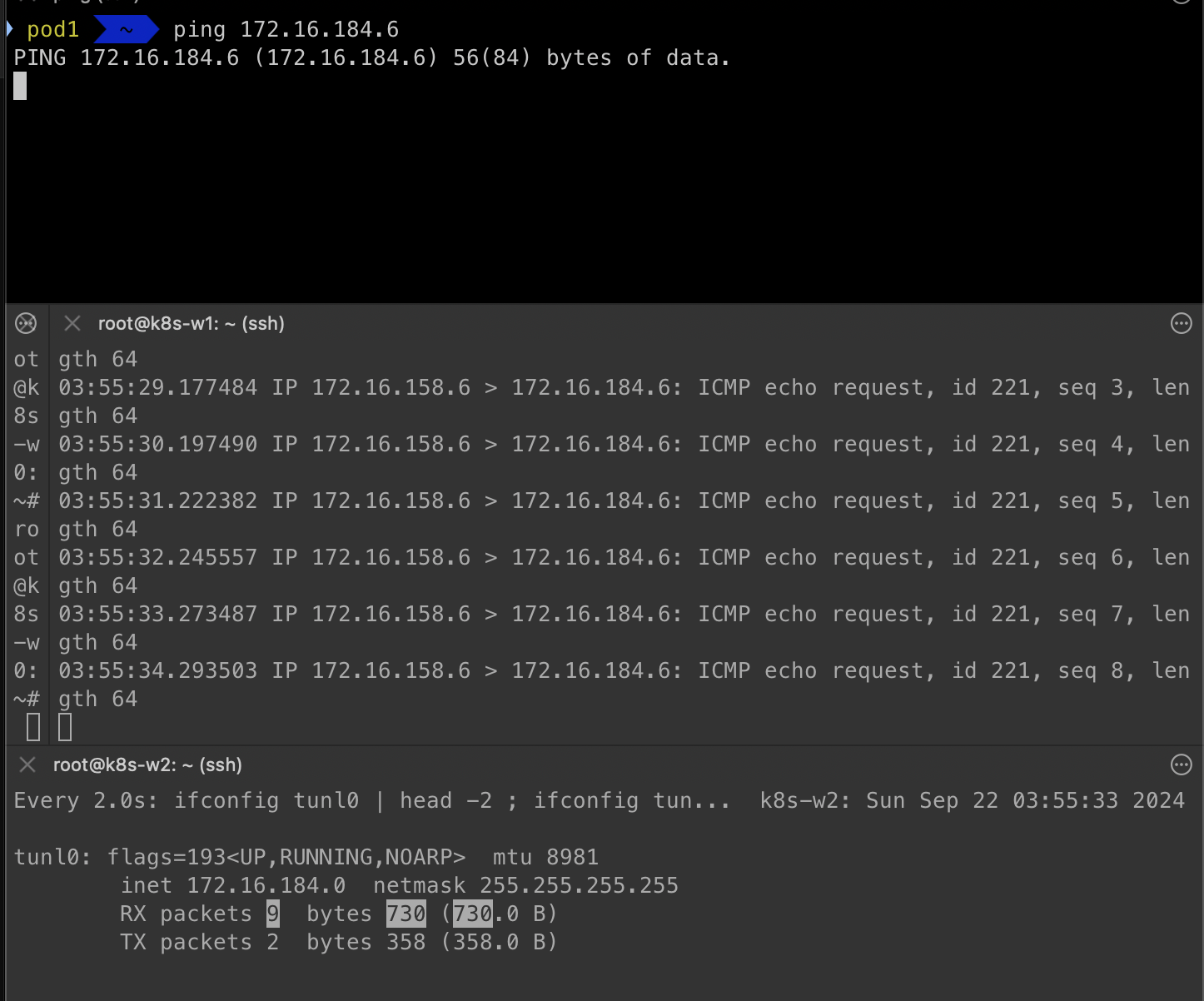 ⇒ 터널 인터페이스에 파드간 IP 패킷 정보 확인