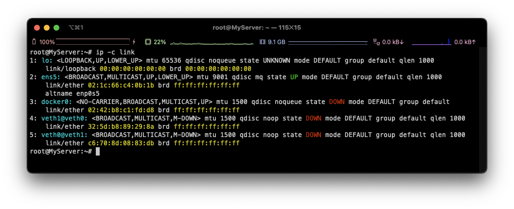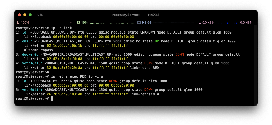 ip netns exec RED ip link set reth0 up; ip link set reth1 up