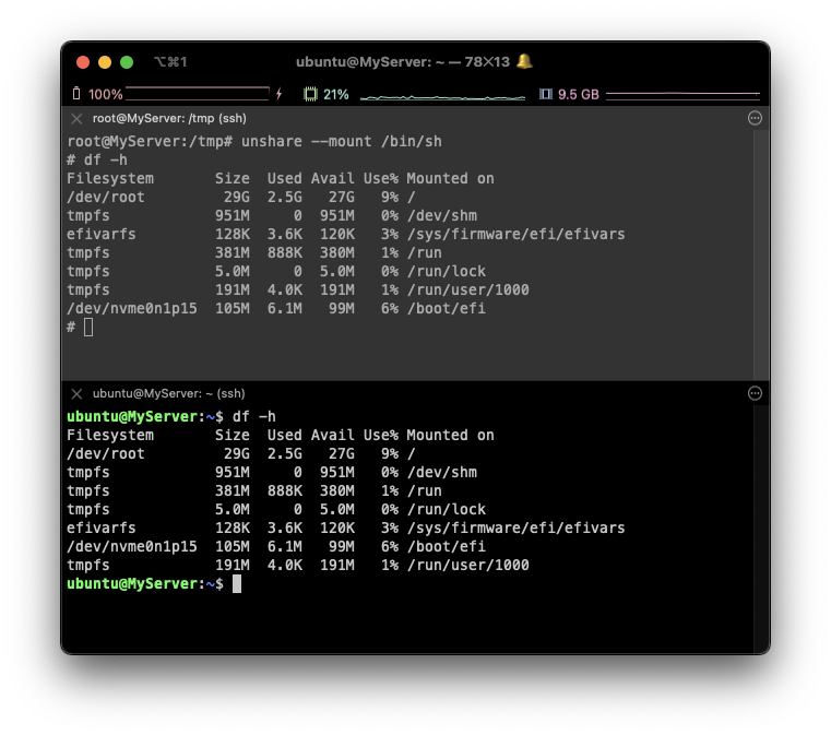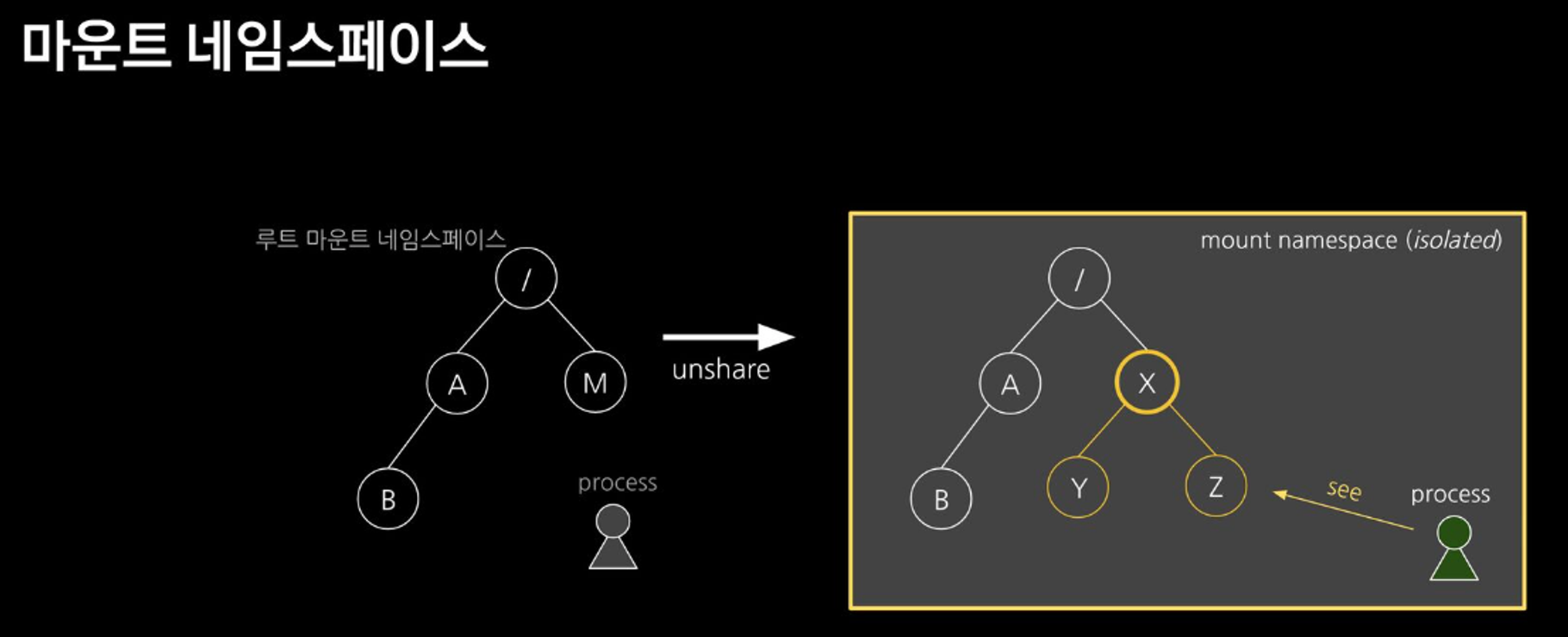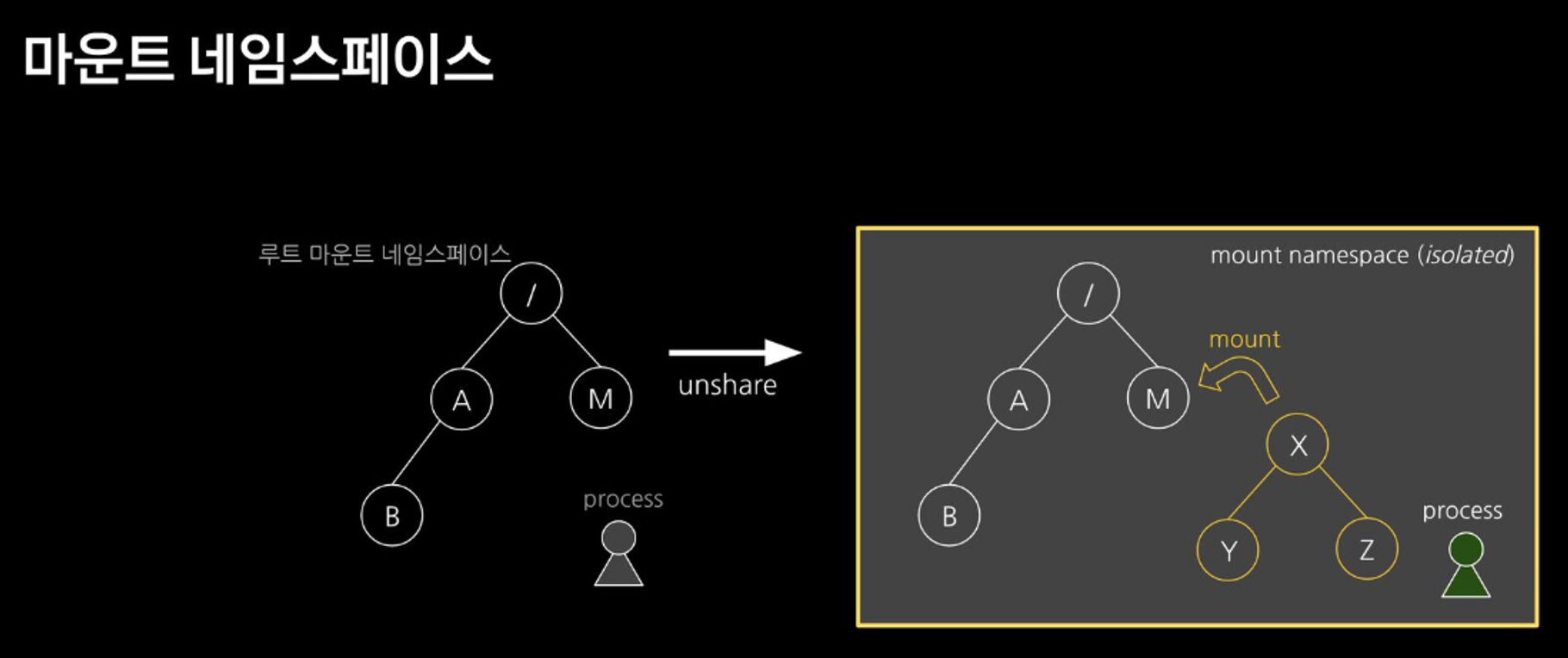 : 새로운 네임스페이스를 만들고 프로그램을 실행unshare --mount /bin/sh