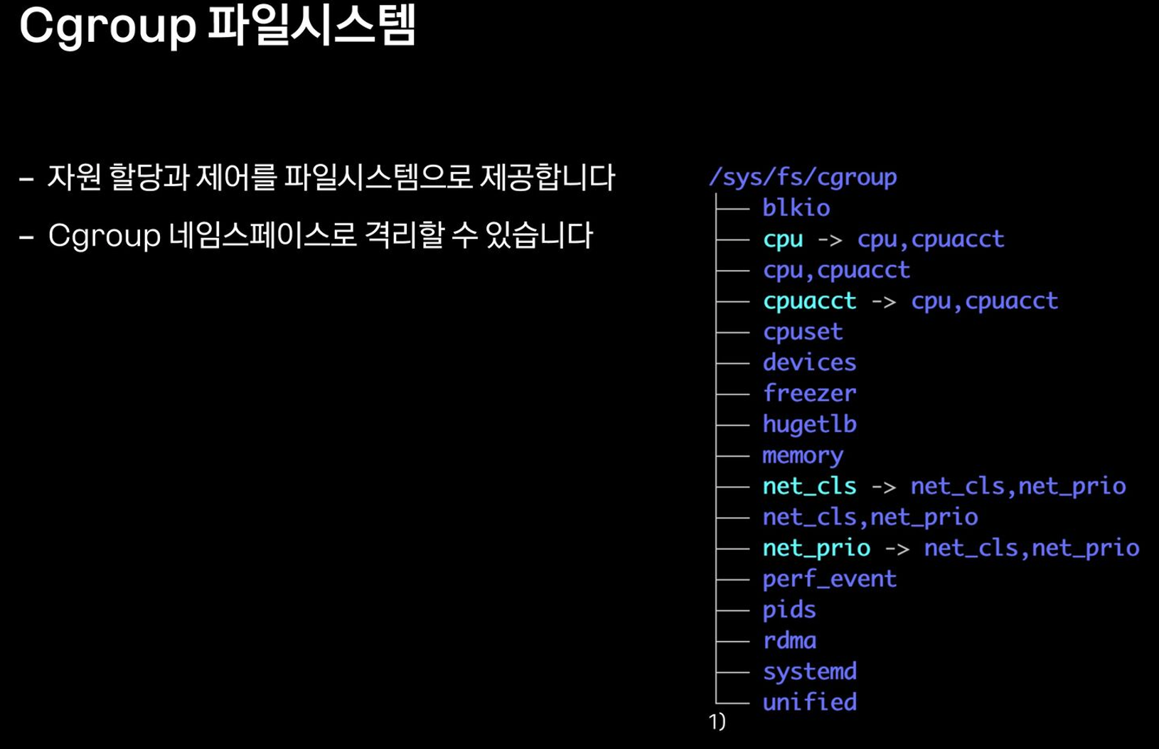 Control Groups : 프로세스들의 자원의 사용을 제한, 격리시키는 리눅스 커널 기능