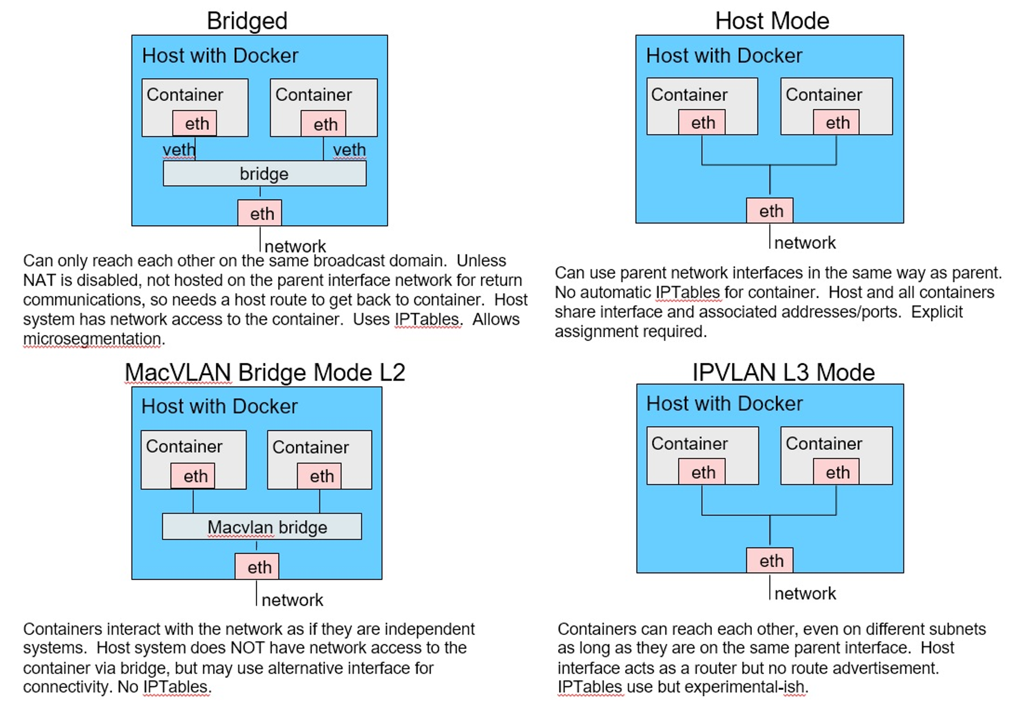Bridge, Host, None + @(macvlan, ipvlan, overlay)