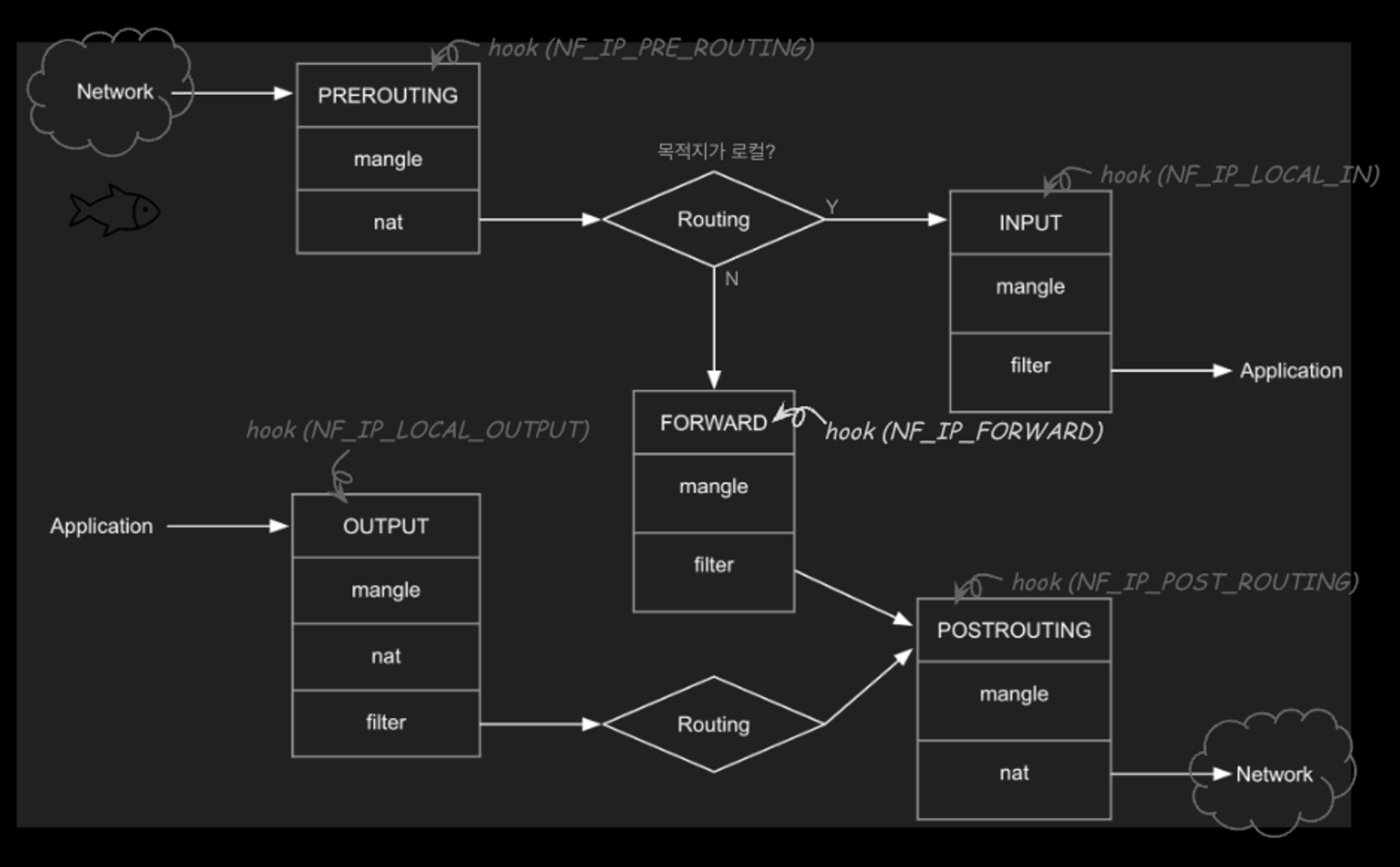 ## POSTROUTING : 라우팅 Outbound or 포워딩 트래픽에 의해 트리거되는 netfilter hook