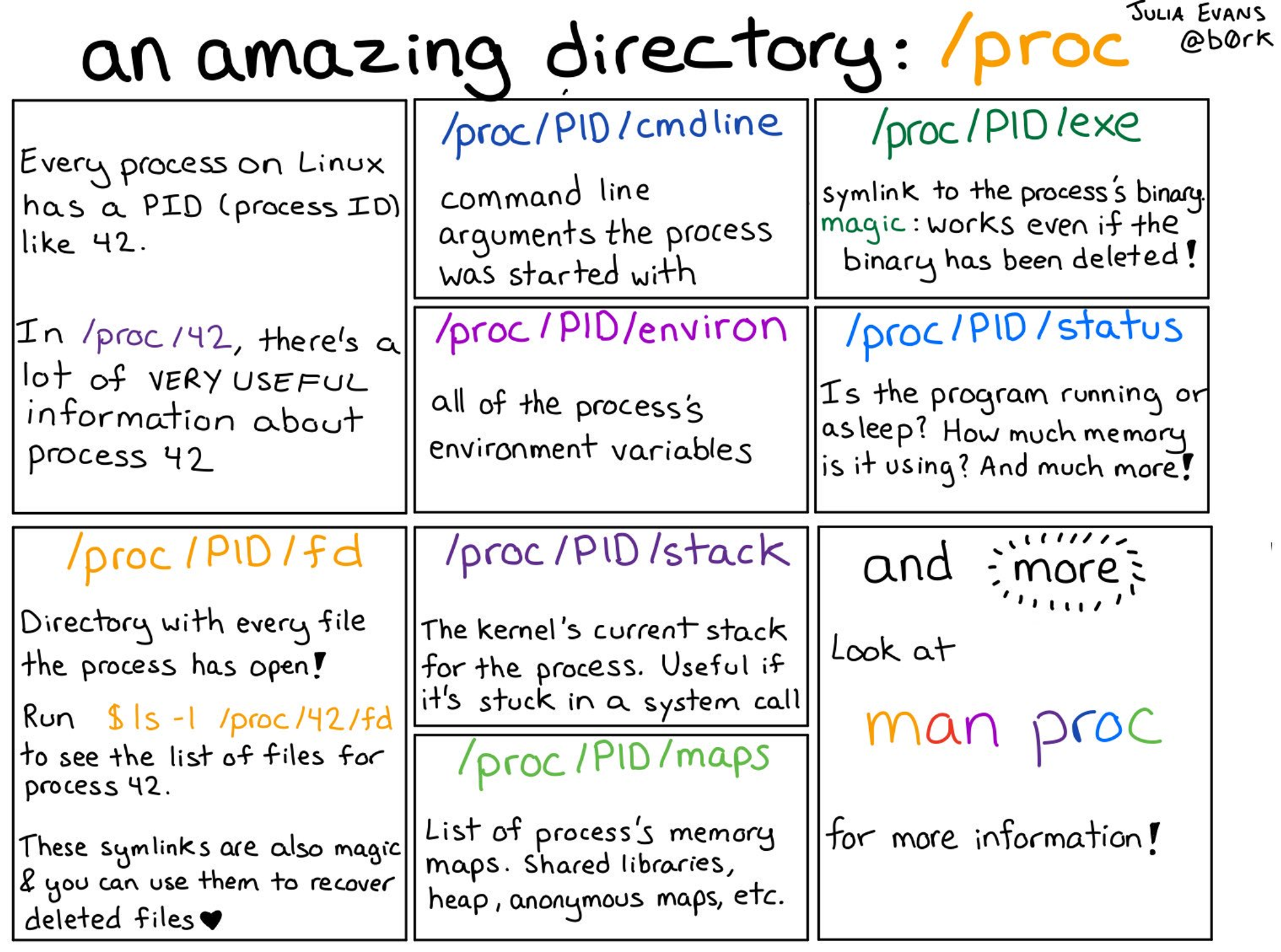 : 프로세스의 상태 정보를 포함한 파일 (프로세스의 상태, CPU 사용량, 메모리 사용량, 부모 프로세스 ID, 우선순위 등)/proc/[PID]/status