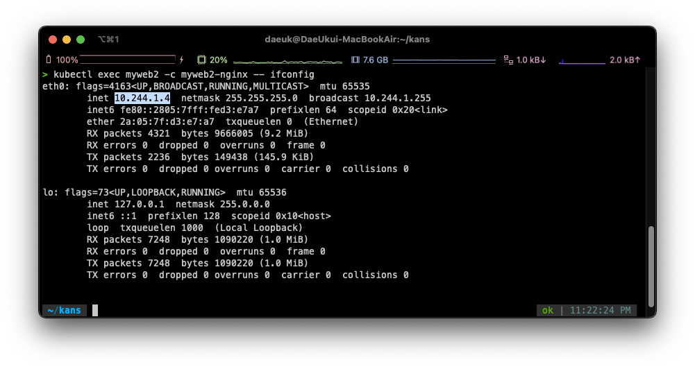 kubectl exec myweb2 -c myweb2-nginx -- ifconfig
