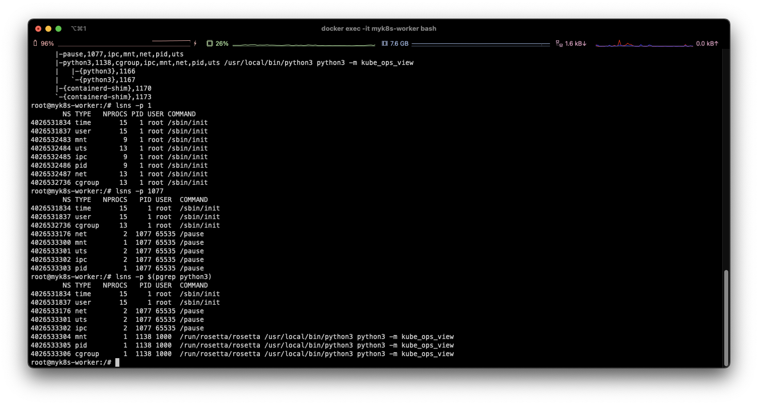lsns -p $(pgrep nginx) # app 컨테이너(metrics-server)