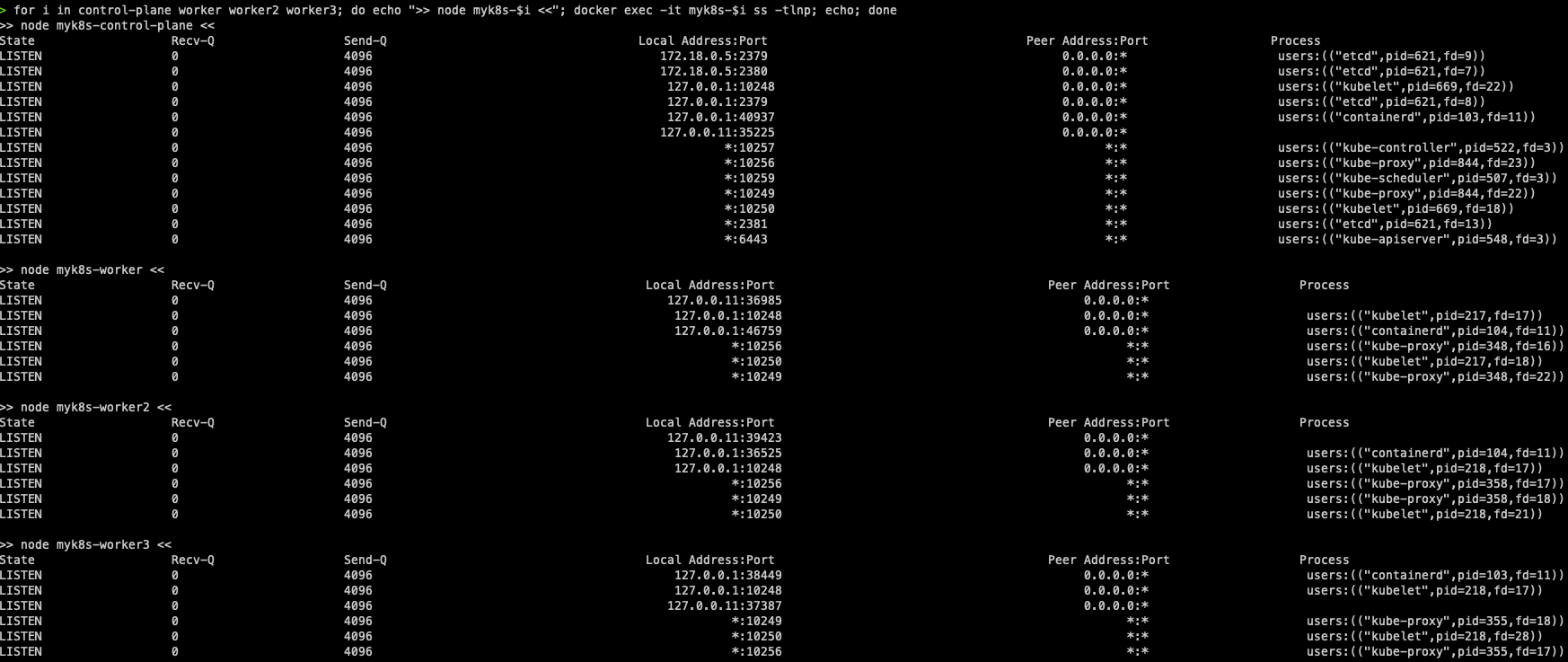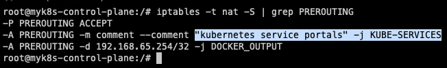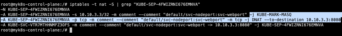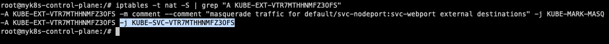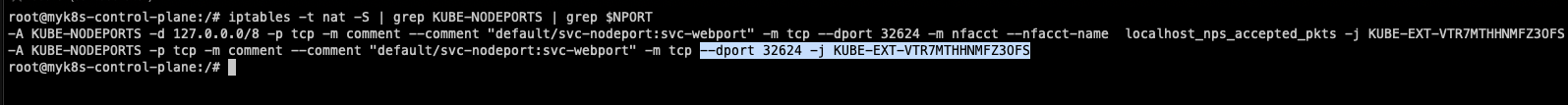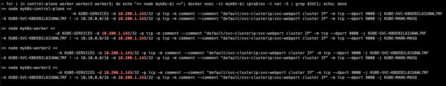 for i in control-plane worker worker2 worker3; do echo ">> node myk8s-$i <<"; docker exec -it myk8s-$i iptables -t nat -S | grep $SVC1; echo; done