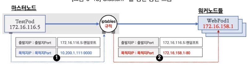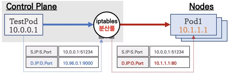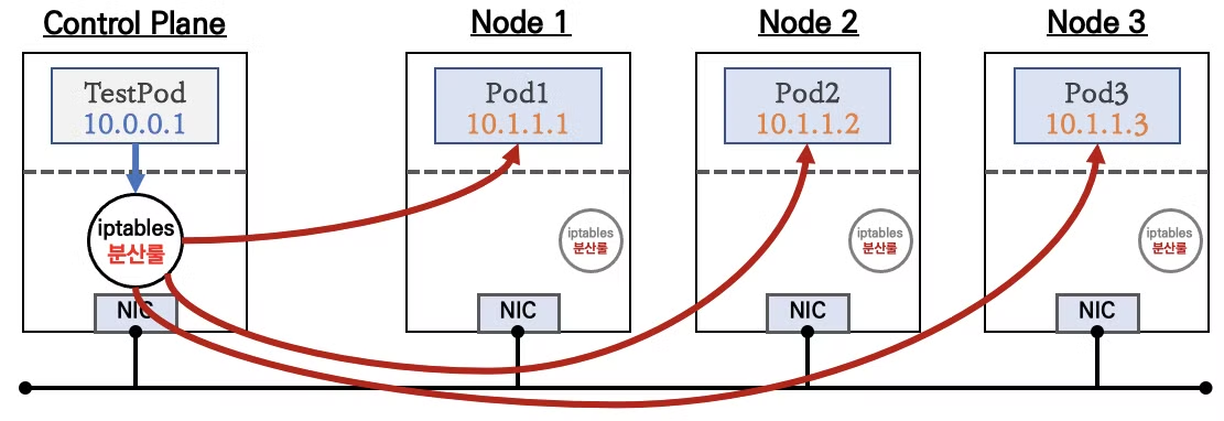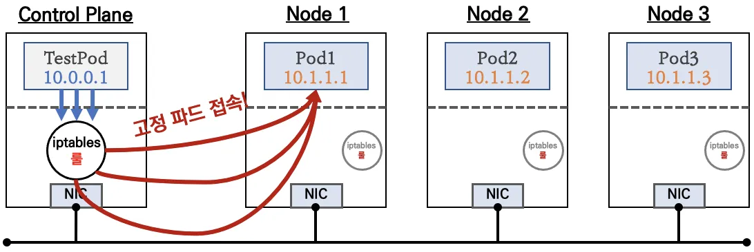 클라이언트(TestPod)가 'CLUSTER-IP' 접속 시 해당 노드의 iptables 룰(랜덤 분산)에 의해서 DNAT 처리가 되어 목적지(backend) 파드와 통신!