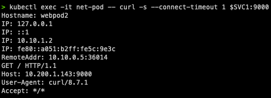 kubectl exec -it net-pod -- curl -s --connect-timeout 1 $SVC1:9000
