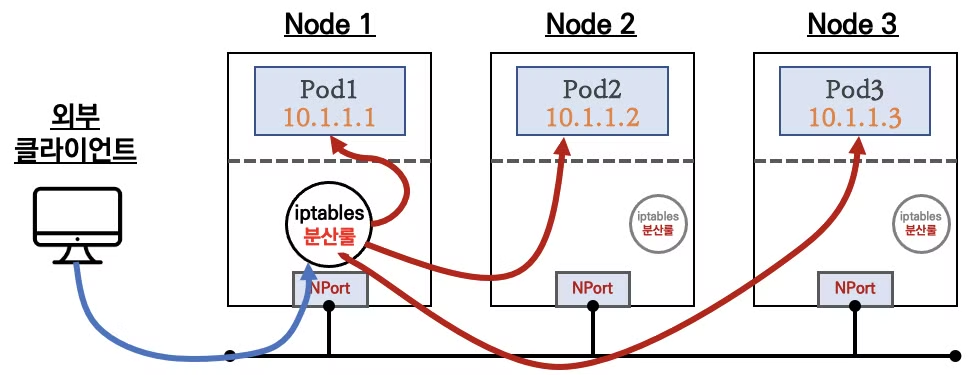 외부에서 클러스터의 NodePort로 접근 가능, 이후에는 Cluster IP 통신과 동일