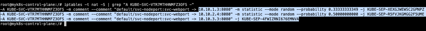 # SVC-### 에서 랜덤 확률(대략 33%)로 SEP(Service EndPoint)인 각각 파드 IP로 DNAT 됩니다!