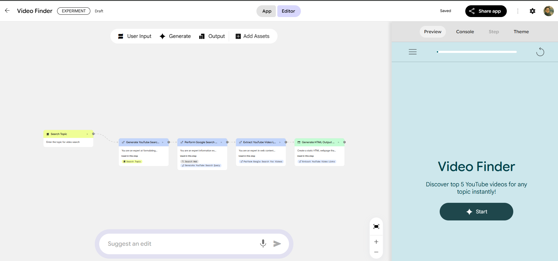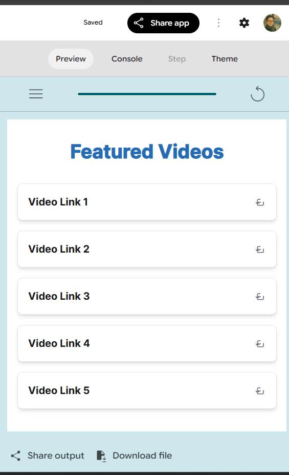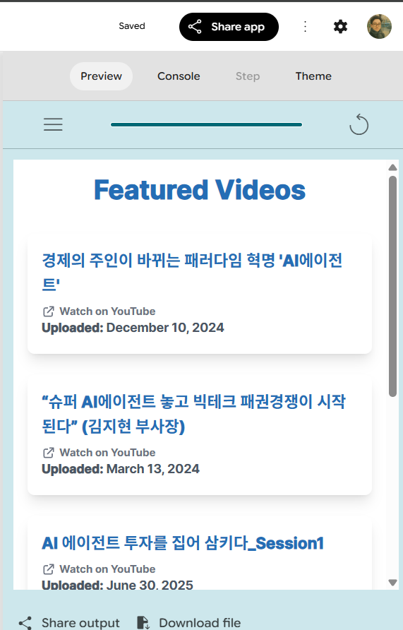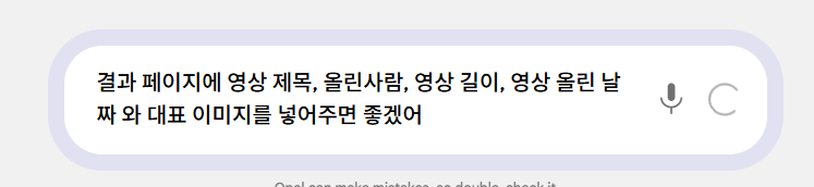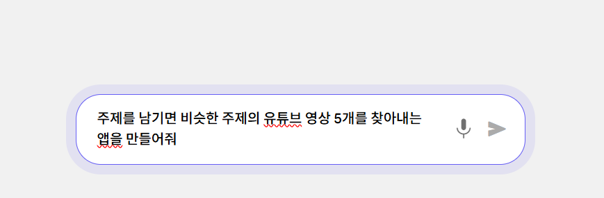 prompt : 주제를 남기면 비슷한 주제의 유튜브 영상 5개를 찾아내는 앱을 만들어줘