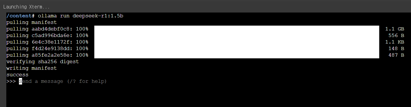 8.터미널 추가 띄워서 ollama run deepseek-r1:1.5b 받음