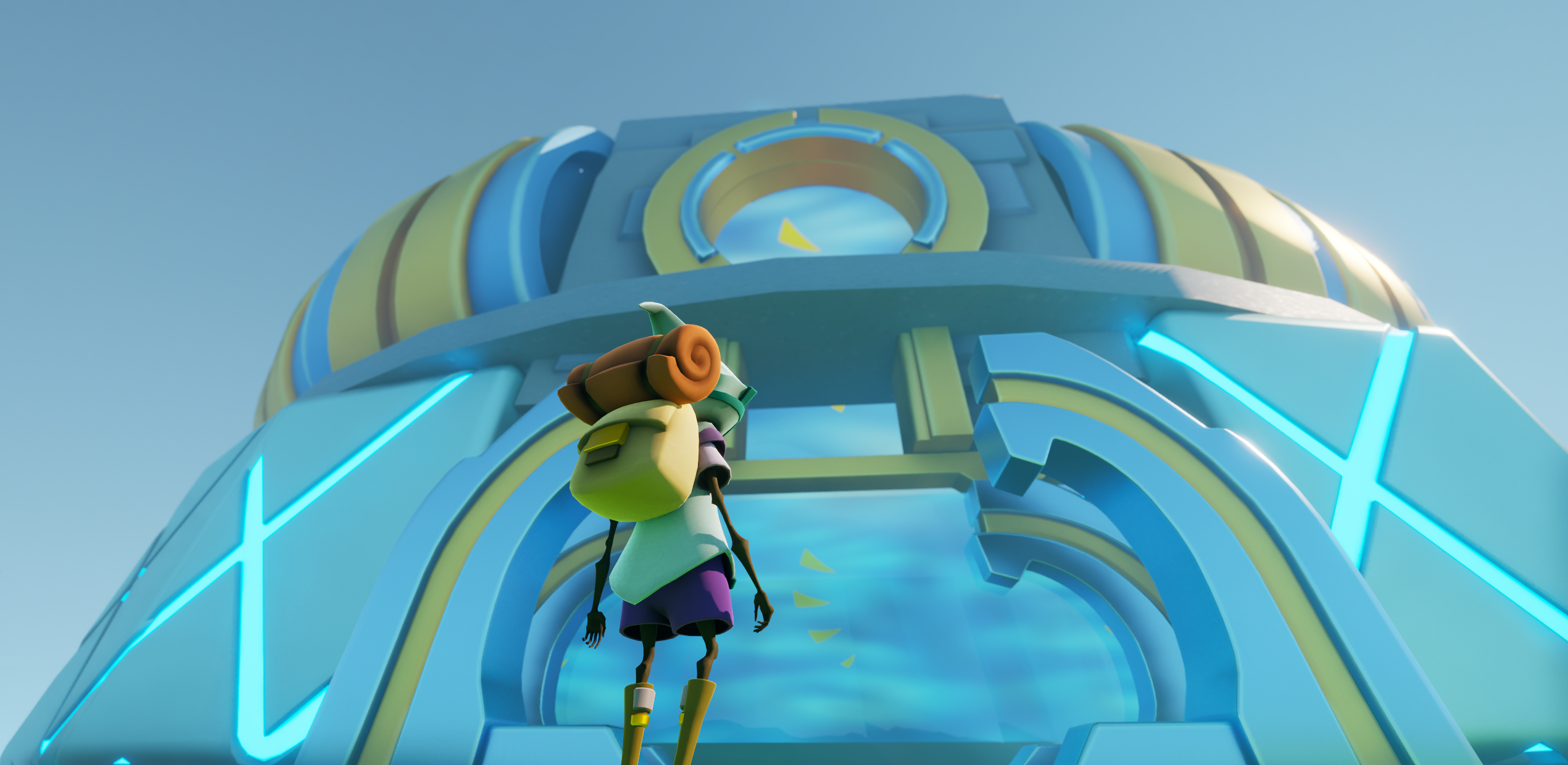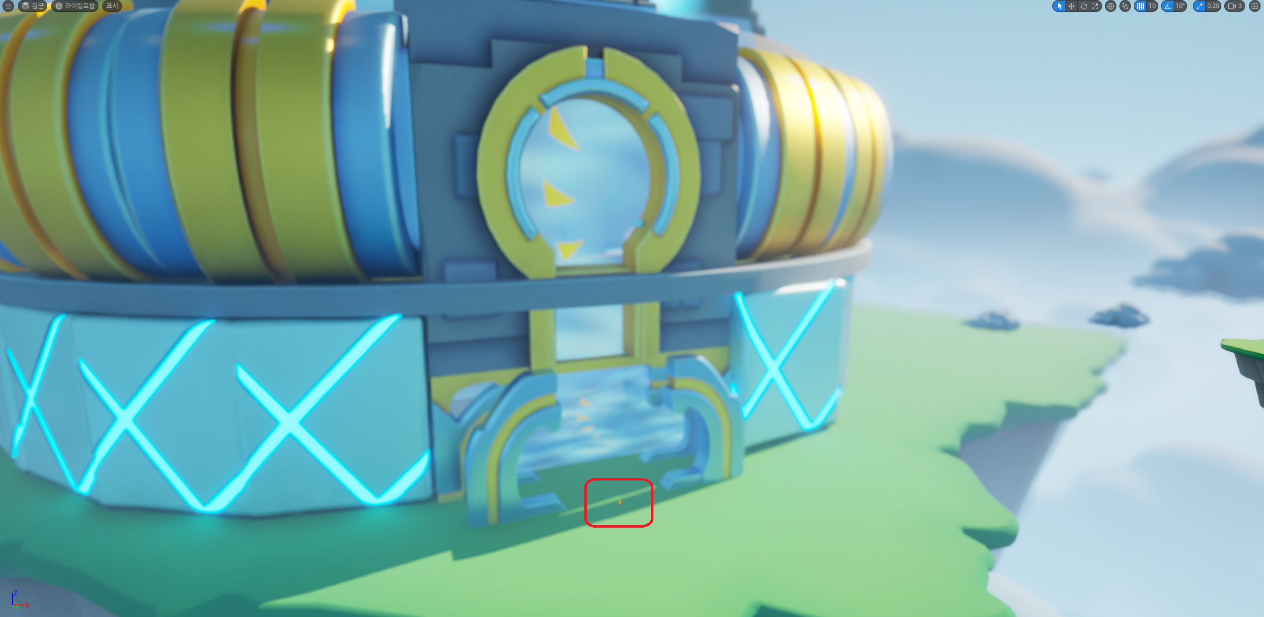 아래 스샷을 보면 주인공 캐릭터가 거의 개미처럼 보일만큼 큰 건물이고 기본 에셋들로만 프로토스의 느낌을 표현하려다보니 어려움이 있었다.