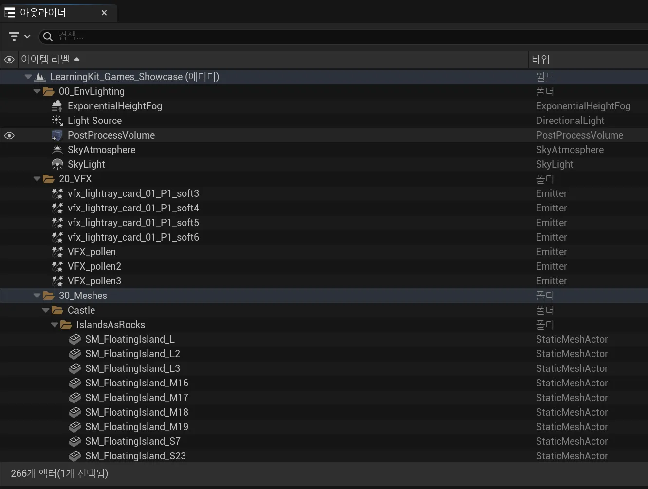 보통은 아래 스샷처럼 오브젝트의 성격에 따라 조명, 스태틱 메시, VFX와 같은 폴더들로 나누고 오브젝트를 계층적으로 관리하는게 관례라고 한다.