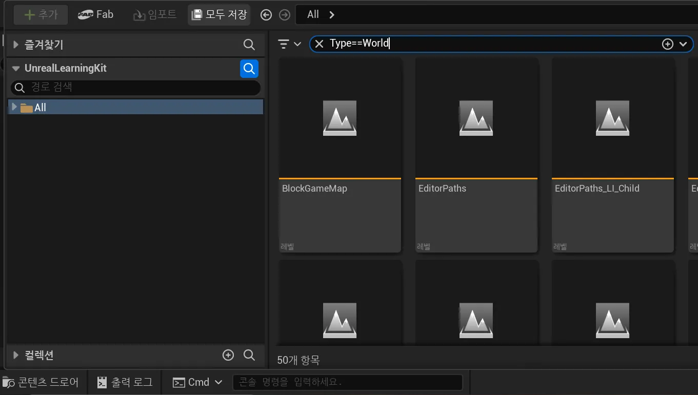 'Type==World'로 검색하면 해당 프로젝트 내 레벨 파일들을 볼 수 있다.