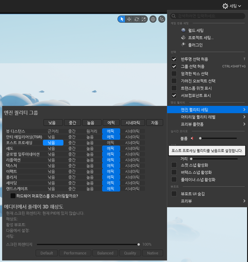 그래서 고민하다가 세팅을 만져보기로 했고 아래 사진의 방법을 통해 금방 해결할 수 있었다. (포스트 프로세싱을 낮음으로 변경했다.)