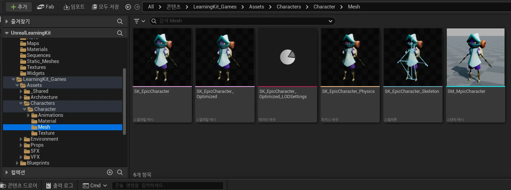 화면 하단에 위치하며, 프로젝트에 사용되는 모든 에셋(모델,텍스처,머터리얼 등)을 관리한다.