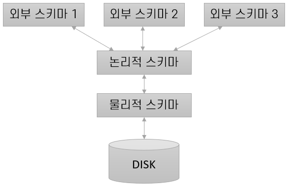 물리적 데이터 독립성 – 물리적 레벨에서 변경이 일어나더라도 그 구조에 기반한 응용 프로그램은 변경되어서는 안된다.