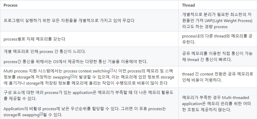 더 효율적이고 한 프로세스가 자원을 공유하기 때문에 수행능력이 향상된다(자원의 생성, 관리의 중복 최소화)