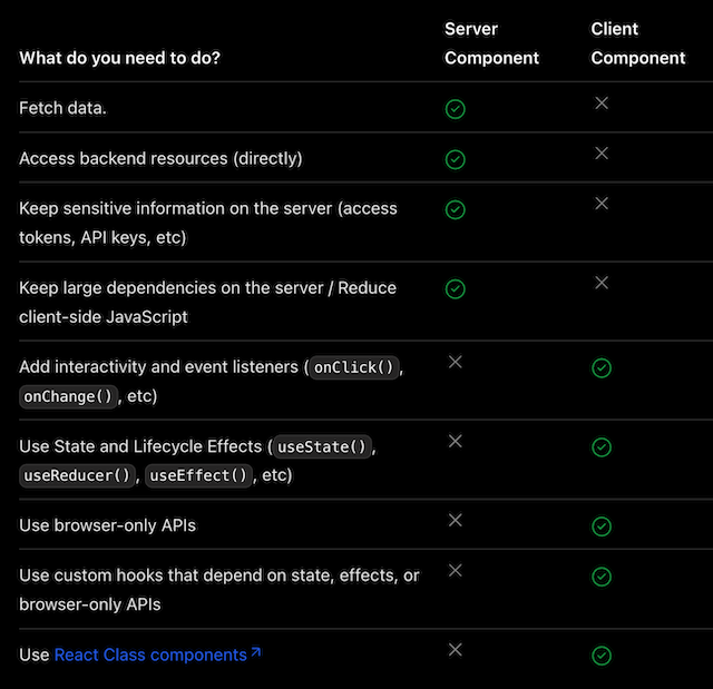 - 보안: 서버 컴포넌트는 클라이언트에 민감한 정보(예: 데이터베이스 비밀번호)를 전송하지 않는다. 이로 인해, 필요한 작업을 안전하게 처리하면서 동시에 클라이언트의 보안을 유지할 수 있다.