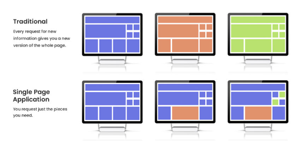전통적인 웹사이트에서는 사용자가 웹사이트 내의 다른 페이지로 이동하면, 브라우저가 페이지를 보여주기 위해 매번 HTML 파일로 된 "페이지 전체"를 불러와야만 했다.
