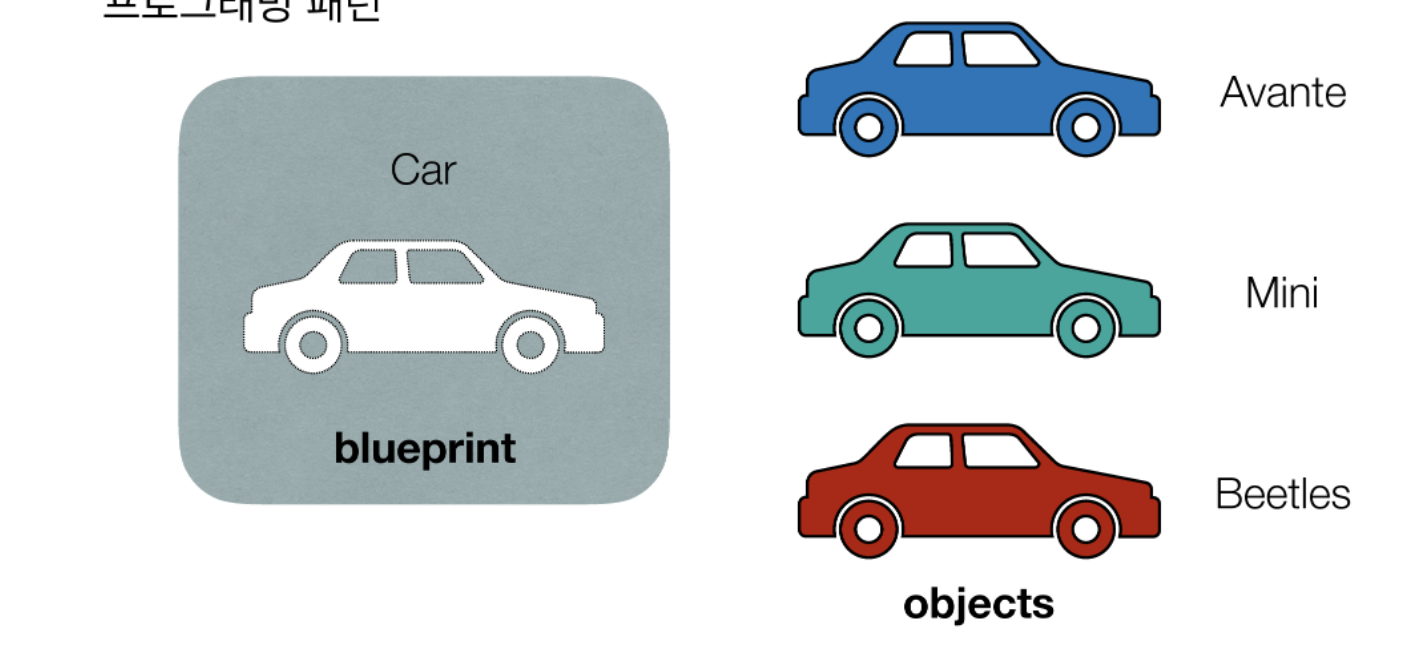 이런 설계도(청사진)를 바탕으로 각각의 객체가 특정한 자동차 모델로 나오게 되는 것이다.